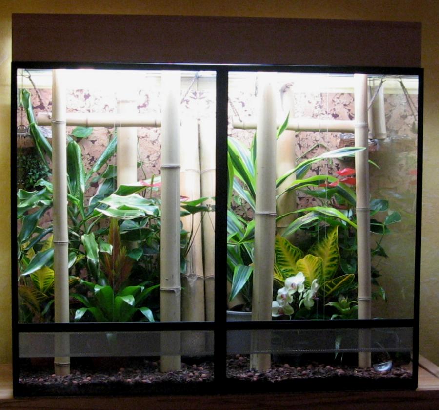 Als wir vor einigen Jahren unsere ersten Terrarien hergerichtet haben und mit Beleuchtung versahen, glich das ganze eher einem wirren Durcheinander von Lampen und Kabeln in und auf dem Becken. Irgendwann kam meiner Freundin der Gedanke, ähnlich wie bei Aquarien, einen Beleuchtungskasten zu verwenden. Da wir gerade dabei waren, uns ein erstes Blockterrarium für Nachzuchten einzurichten, wurde der Gedanke des Beleuchtungskastens direkt in die Tat umgesetzt. Der Vorteil eines Beleuchtungskastens ist, dass die ganze Terrarienanlage viel ordentlicher aussieht. Weiterhin staut sich auch mehr Wärme in das Terrarium zurück. So ist es im oberen Bereich des Terrariums mit Beleuchtungskasten um einige Grad wärmer als wenn die Wärme der Leuchtmittel nach oben frei entweichen kann. Nachfolgend wird schrittweise gezeigt, wie wir einen Belsuchtungskasten für zwei nebeneinander stehende Terrarien der Größe 50x50x80 (BxTxH) gestaltet haben. Die Grundfläche misst 100x50 cm. Der Terrariendeckel besteht mittig zur Hälfte aus einem Edelstahlgazeeinsatz. |